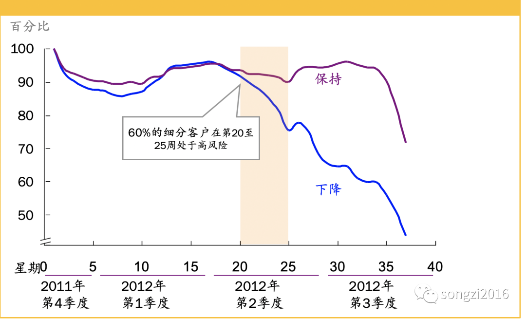 例如下图的流用户流失高风险是在第 20 周至第 25 周。(至于本次案例讲解的 APP 的流失时间拐点,同理的分析方法可以得到的)