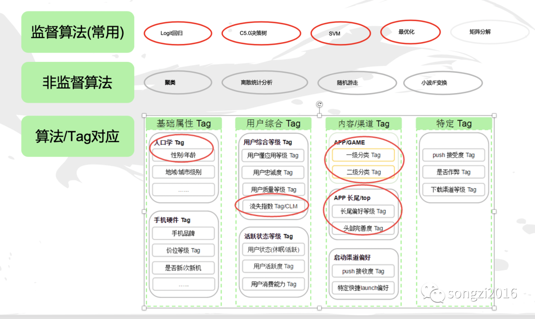 模型准备阶段:模型算法与标签还是有一些关系的,不同的算法可以用在不同标签中。监督算法中会用到logic 回归、c5.0决策树、svm算法、最优算法、神经网络、矩阵算法。非监督类的,聚类、离散统计分析、随机游走、小波/F变换,这些算法用在哪些标签会更合适的,给出一个很明确的图(整个训练过程就不进入深谈)。