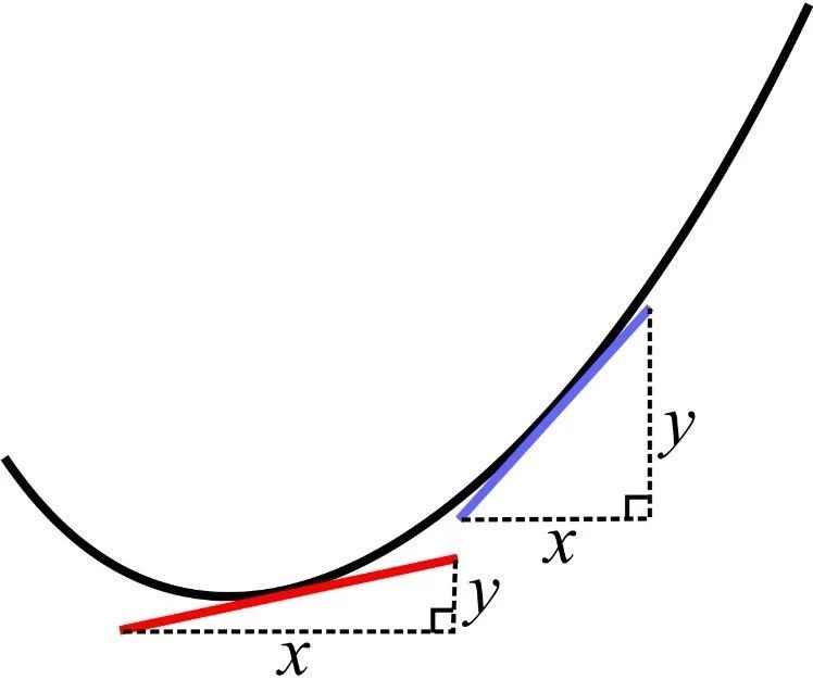 这就跟我们判断跑步的速度是一样的道理:给定一个固定的时间,比如10秒(相当于固定的Δx),看看你能跑多远(相当于Δy),你跑得越远(Δy越大),我就认为你跑得就越快。当然也可以反过来,给定一个固定的距离,比如100米(相当于Δy),你跑的时间越短(Δx越小),我就认为你跑得越快。
