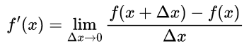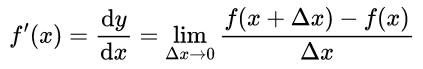 由于割线的斜率就是用这两点的纵坐标之差f(x+Δx)-f(x)除以这两点的横坐标之差(x+Δx-x=Δx),而导数f(x)’是割线斜率的极限。那么,我们在割线斜率的前面加一个极限符号就可以表示导数f(x)’了: