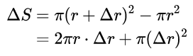 我们都知道半径为r的圆的面积公式是S=πr²。如果我们让半径增加Δr,那么新的圆的面积就应该写成π(r+Δr)²,那么,增加的面积ΔS就应该等于两个圆的面积之差: