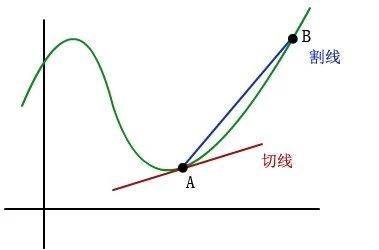 传统上我们可以这样定义切线:先随便画一个直线,让这条直线与曲线有两个交点,这样的直线叫割线(仿佛把曲线“割断”了,如下图蓝色的AB)。然后,我们让B点沿着曲线慢慢向A点靠近,直观上,等到B点和A点重合之后,割线AB就变成了曲线在A点的切线。