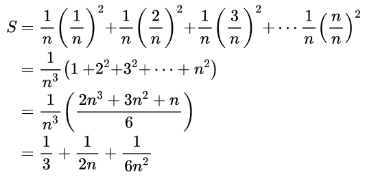 但是到了17世纪,我们是怎么得到抛物线与x轴围成的面积等于1/3的呢?我们得到了n个矩形的面积公式: