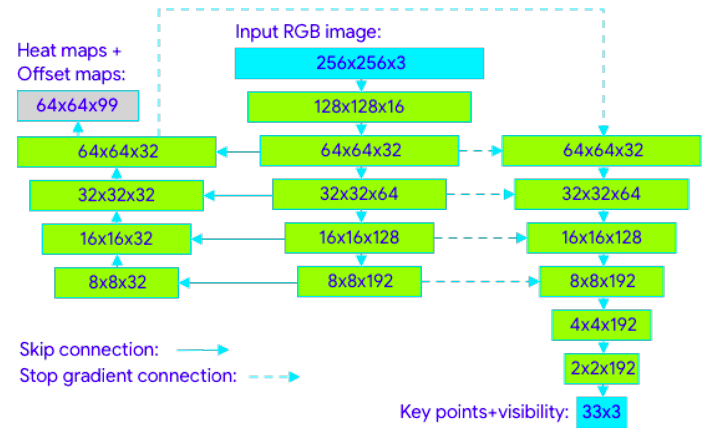 研究人员表示,「即使参数数量较少,堆叠式沙漏架构也可以显着提高预测质量。我们在工作中扩展了这个想法,并使用编码器-解码器网络体系结构预测所有关节的热图,然后使用另一个编码器直接回归到所有关节的坐标。我们工作背后的关键点是可以在推理过程中丢弃热图分支,使其足够轻巧,可以在手机上运行。」