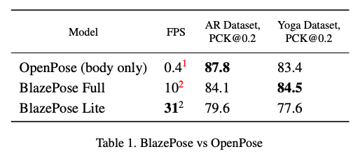 在推断过程中,采用推断身体33个关键点的轻量卷积网络,用编解码器直接推断边框,并在Pixel 2手机上推断速度可达到30fps。BlazePose在中端手机CPU上性能比20核桌面CPU上的OpenPose还要快25-75倍。