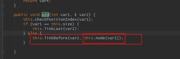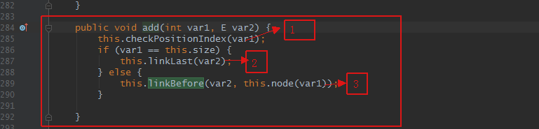 3.当添加的下标位置和数组长度不相等的时候,则进入 linkBefore 方法 ,linkLast,linkBefore 这两个方法,只是将尾部和头部的数据中的Node对象进行了替换,同时更新了Node 里面的前节点对象和后节点对象信息