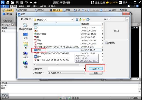 2、启动迅捷CAD编辑器软件后,进入到编辑器操作页面,我们开始转换文档,点击打开选项,弹出的新窗口中找到我们要转换的CAD图纸,选中点击确认,导入到编辑器中。
