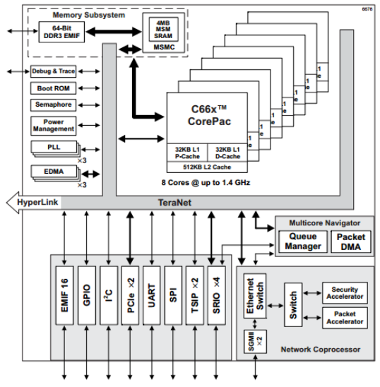 TI TMS320C6678是一款TI KeyStone C66x多核定点/浮点DSP处理器,集成了8个C66x核,每核心主频高达1.0/1.25GHz,支持高性能信号处理应用,拥有多种工业接口资源,以下是TMS320C6678 CPU功能框图: