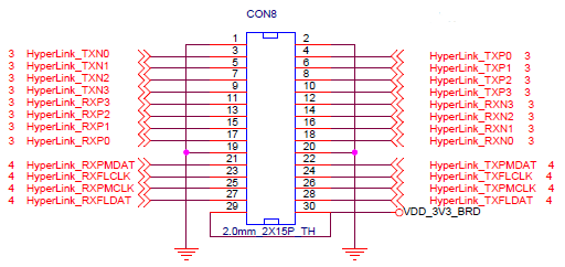 开发板CON8为HyperLink接口,采用2*15pin、2.0mm间距双排针连接方式。HyperLink接口最高通信速率40GBaud,是KeyStone处理器间互连的理想接口,硬件及引脚定义如下图: