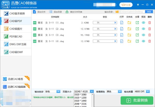 步骤二:接着,在下方对输出色彩、页面大小、背景颜色、输出质量进行个性化设置。笔者分别选择的是彩色、10240*4320、黑色、4800 DPI。最后,我们点击右下角的“批量转换”按钮就可以将DWG转为PDF了。