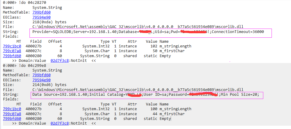 既然 解密算法 埋在客户端你都能挖出来,那把它放在 server 端不就可以啦? 在程序启动的时候,调用一下 webapi 进行解密,这样你总没辙了吧 ??? 哈哈,大家可以开动脑子想一想,这种方法可行不可行?诚然,解密算法搬走了,再用 ILSpy 去挖已经没有任何意义了,但这里有一个重要突破点,不管是用什么形式解密的,最后的连接串明文都是存放在 OleDbHelper.ConnectionString 这个静态变量中,对吧!接下来的问题就是有没有办法把进程中的这个静态变量给挖出来? 你说的对,就是抓程序的 dump文件 用 windbg 去挖。