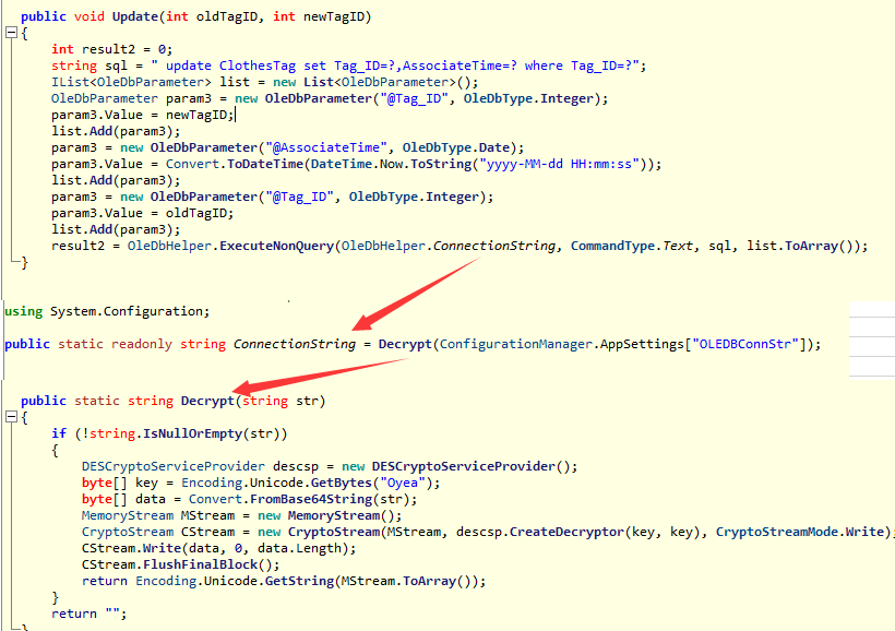 从上图中可以看出,连接串的明文是存放在: OleDbHelper.ConnectionString 中的,然后可以看到,程序中定义了一个 Decrypt 方法专门用来解密连接串,哈哈,有了这个算法,是不是就可以脱库啦??? 如下代码所示: