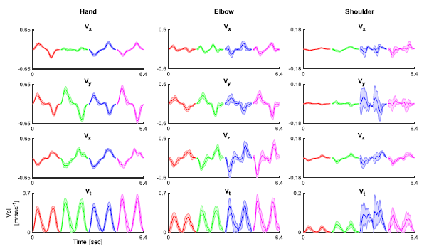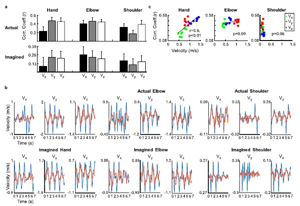 下图为解码手,肘和肩膀的实际和想象的速度曲线。