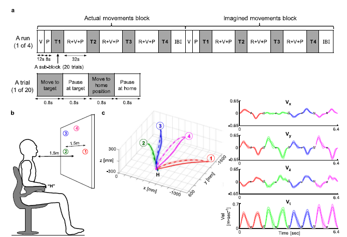 一次试验由四个epoch组成,每个epoch持续800毫秒:指向分布在3D空间的四个目标中的一个,在目标处的暂停时期,返回到home位置(' H ')的运动,以及在home位置的暂停时期。所有的试验在一个给定的子块包括指向相同的目标运动。受试者被告知向前和向后的动作都应与800毫秒的听觉提示同步。对于包含运动想象的实验,受试者被要求保持手臂在原地静止,并与听觉提示同步想象将手臂移向相应的目标,然后回到原地。