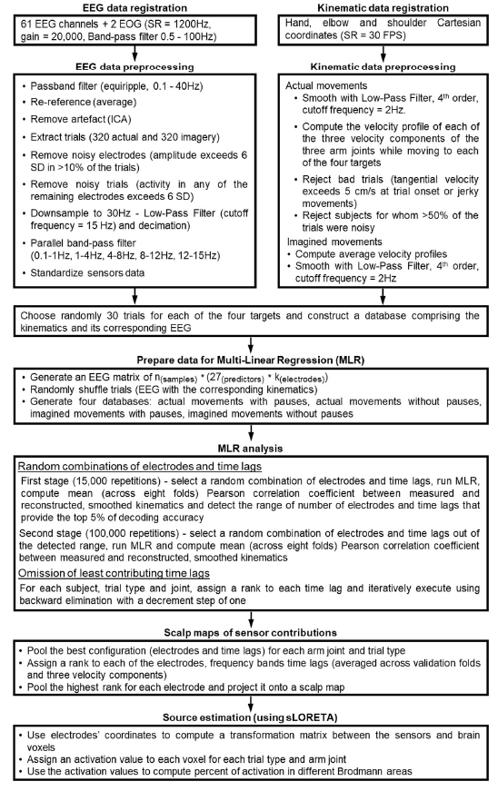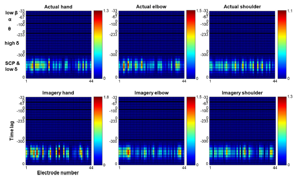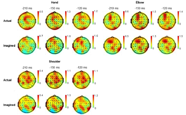 研究人员使用mLR模型(通常用于运动轨迹预测(MTP))并使用源定位来检测和比较大脑之间的相互关系,从而预测了7个受试者在两种运动类型(实际和想象的)的时间序列中在3D空间中的手,肘和肩部轨迹在每个手臂关节实际和想象的动作中激活的区域。