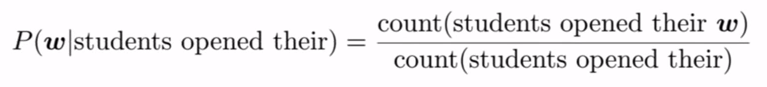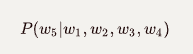 比方说,我们有一个句子‘students opened their’,我们想找到它的下一个单词,比如w。使用4-gram,我们可以用下面的方程来表示上面的问题,这个方程返回‘w’是下一个单词的概率。