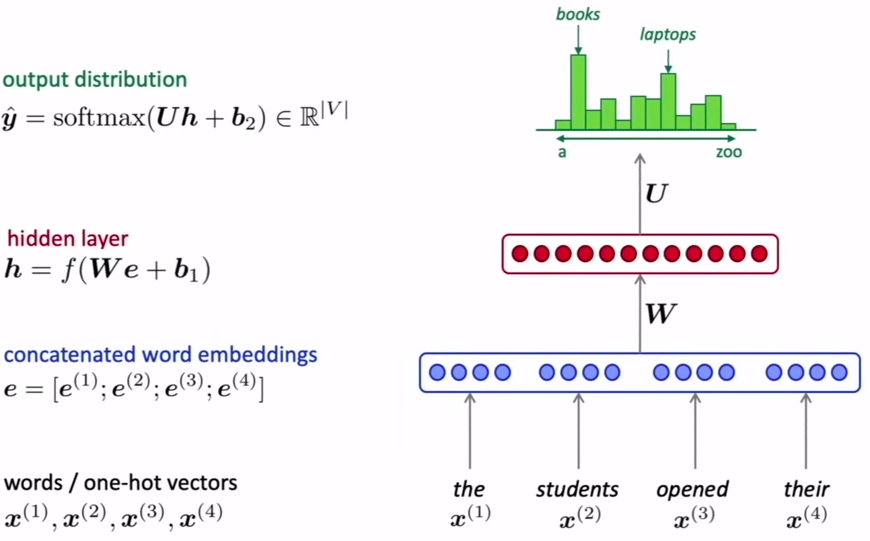 为了使用神经网络生成LM,我们考虑使用一个固定的窗口,即每一次的单词数都固定。如下图所示,然后以独热向量的形式表示单词,并与词嵌入向量相乘,连接以创建矩阵e。然后将该矩阵展平并通过隐藏层。最后使用softmax函数输出。