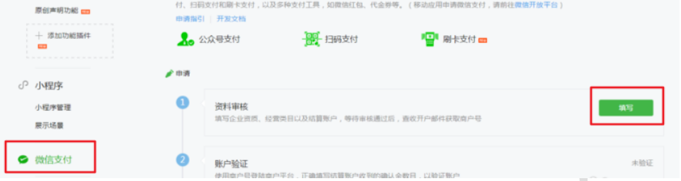 - 登录公众平台,点击左侧菜单【微信支付】,开始填写资料等待审核,审核时间为1-5个工作日内。