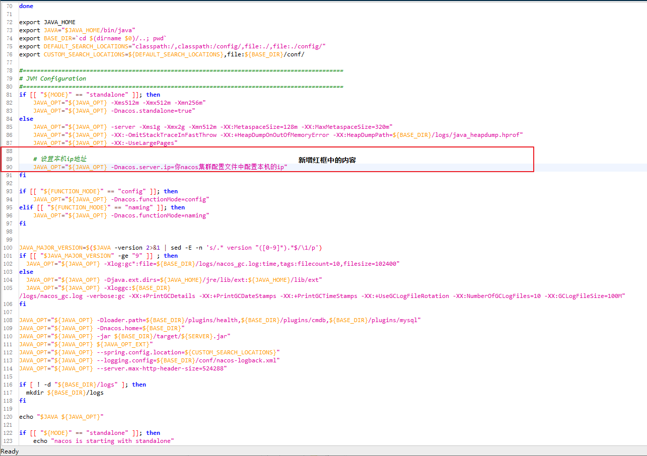 解决办法:在nacos启动脚本 startup.sh 中,在 88行处新增内容: