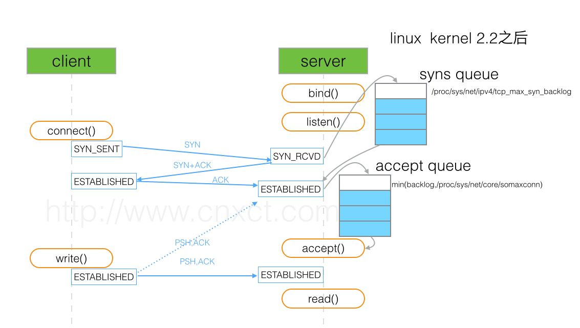 在Linux内核2.2之后,分离为两个backlog来分别限制半连接(SYN_RCVD状态)队列大小和全连接(ESTABLISHED状态)队列大小。