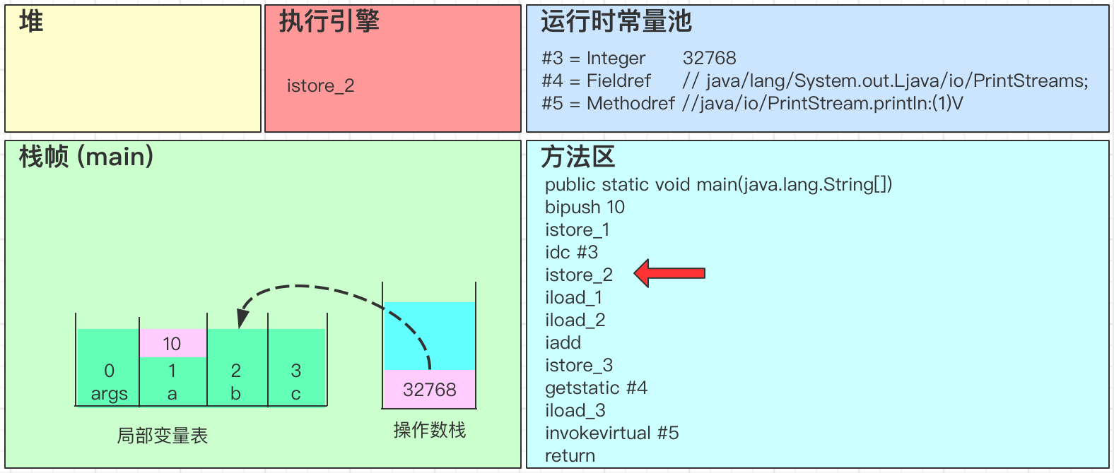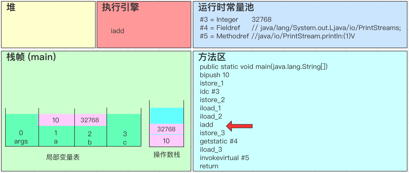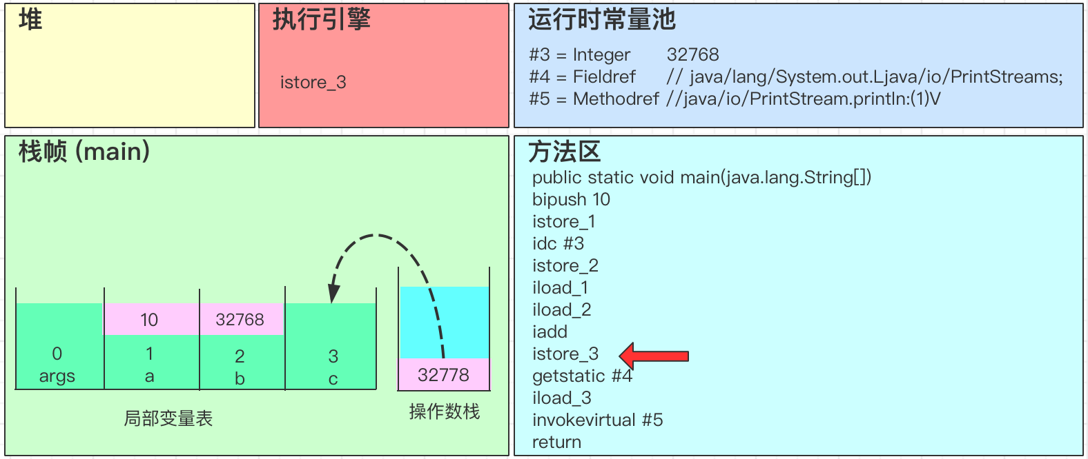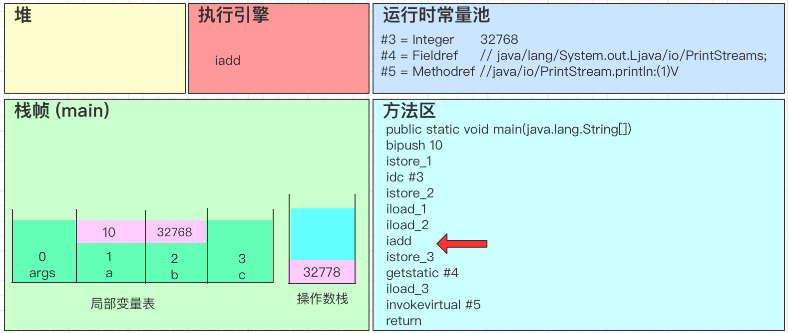 - iadd会弹出操作数栈中的2个变量,并进行求和得到32778,最后将结果32778写回到操作数栈中