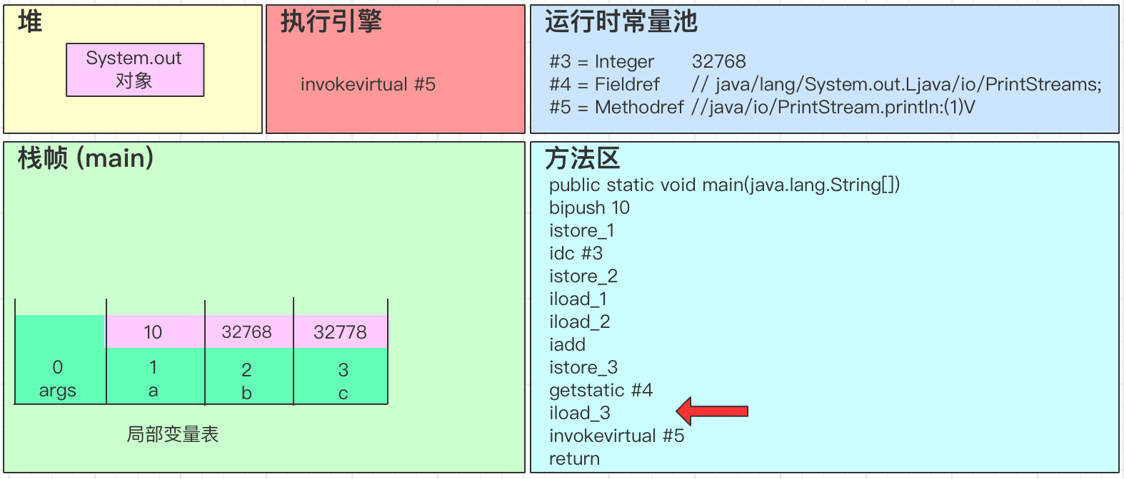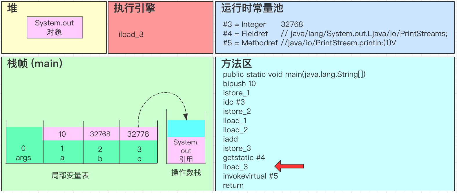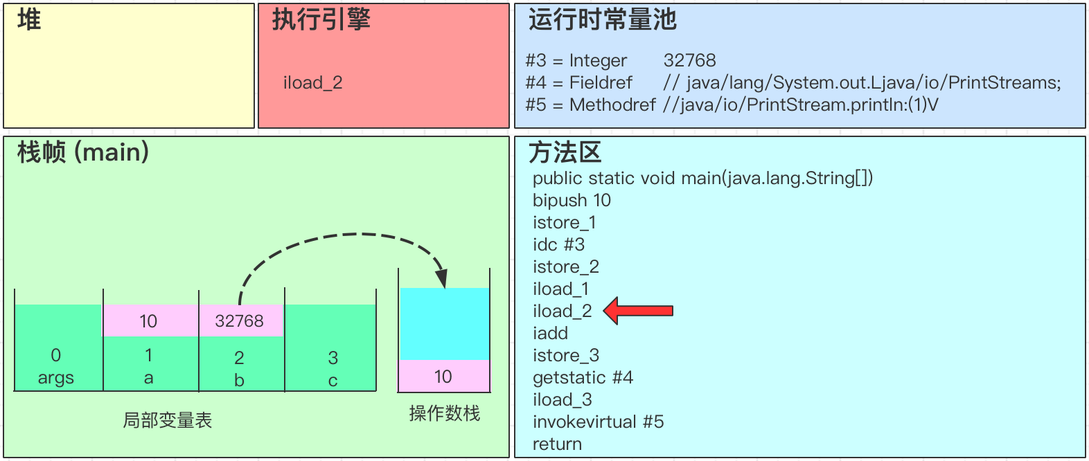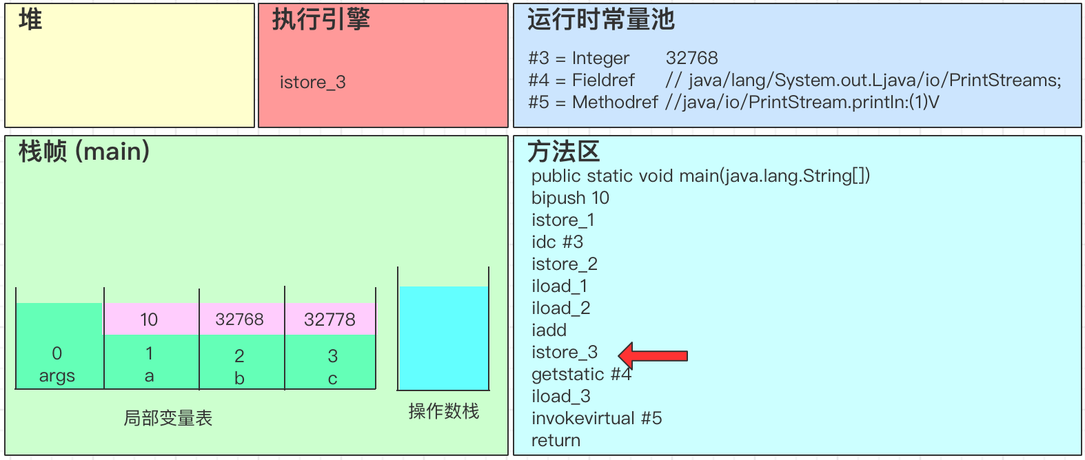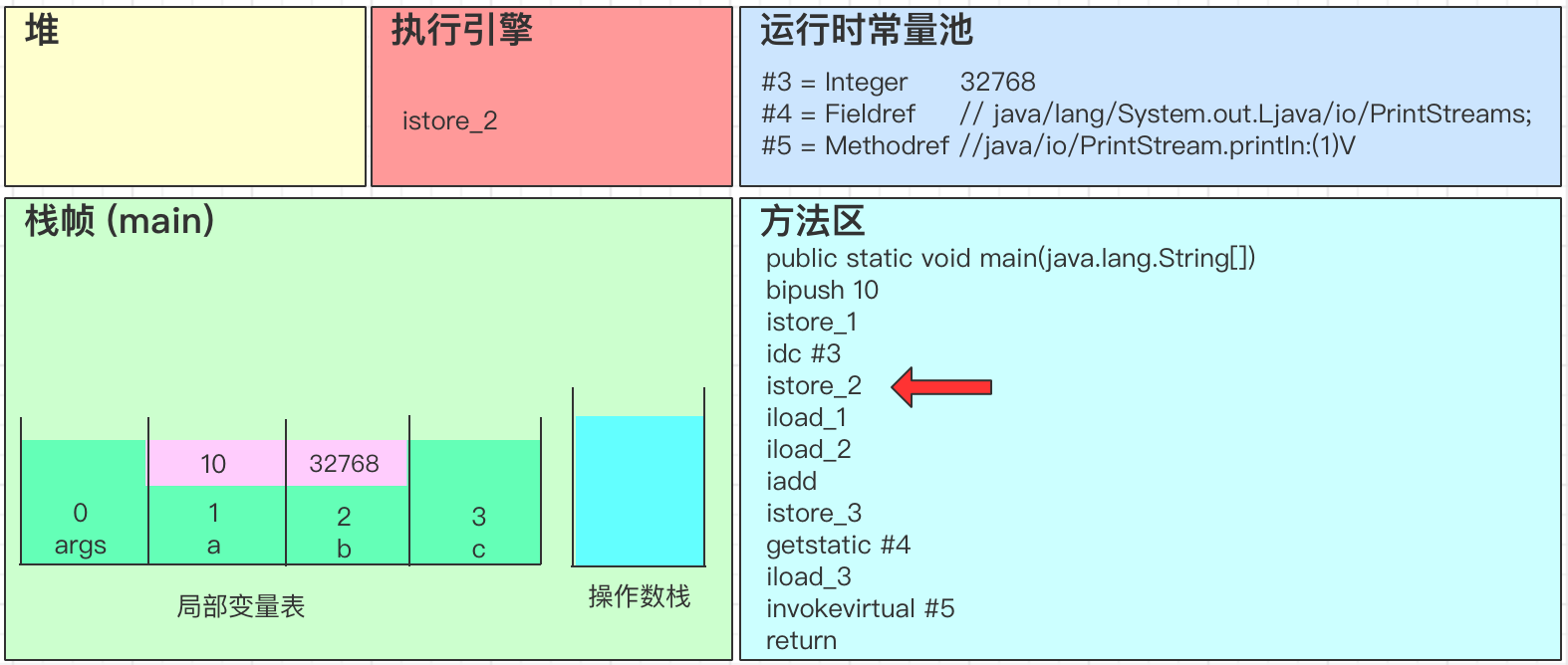 - iadd会弹出操作数栈中的2个变量,并进行求和得到32778,最后将结果32778写回到操作数栈中