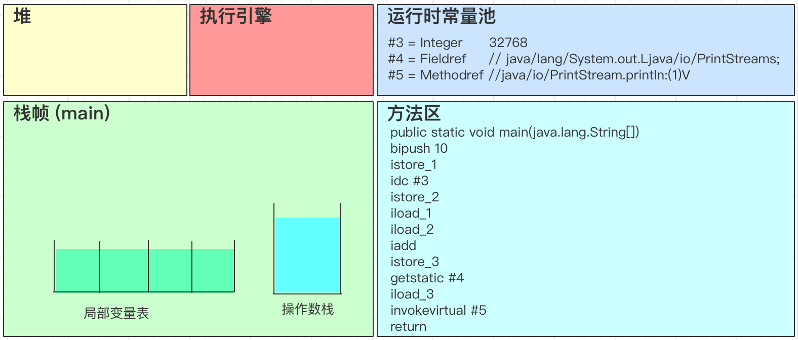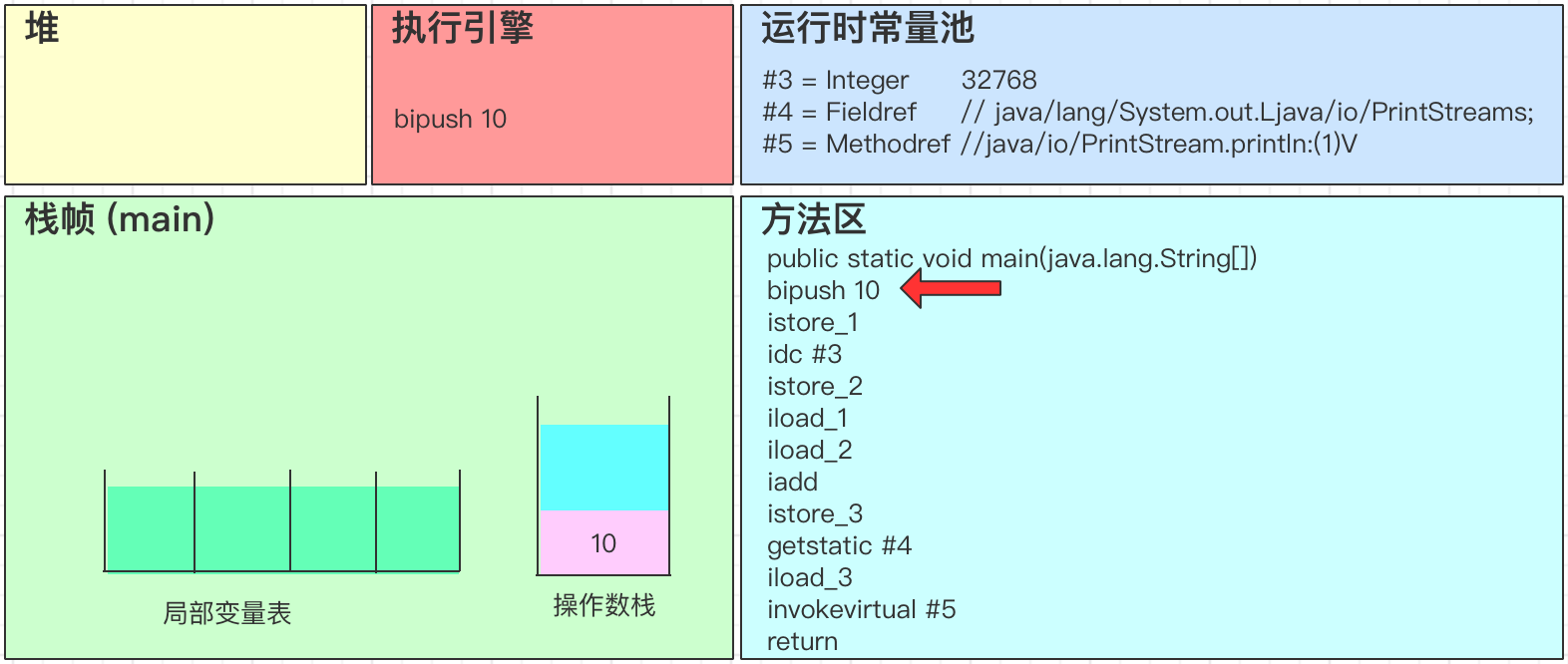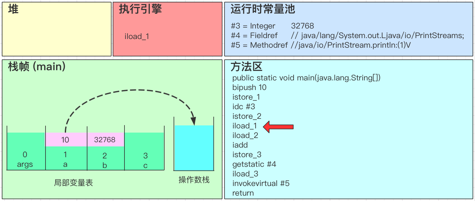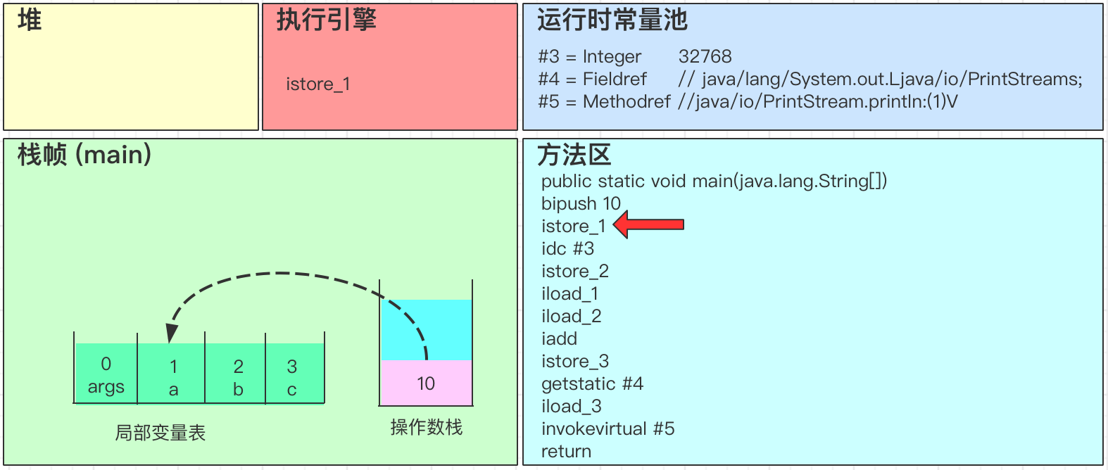 - iadd会弹出操作数栈中的2个变量,并进行求和得到32778,最后将结果32778写回到操作数栈中
