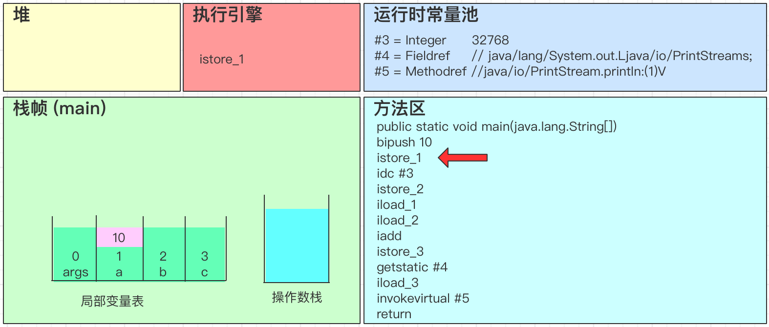 - 将操作数栈顶数据弹出,存入局部变量表的槽位slot 1中,下图的args/a/b/c就是对应的槽位