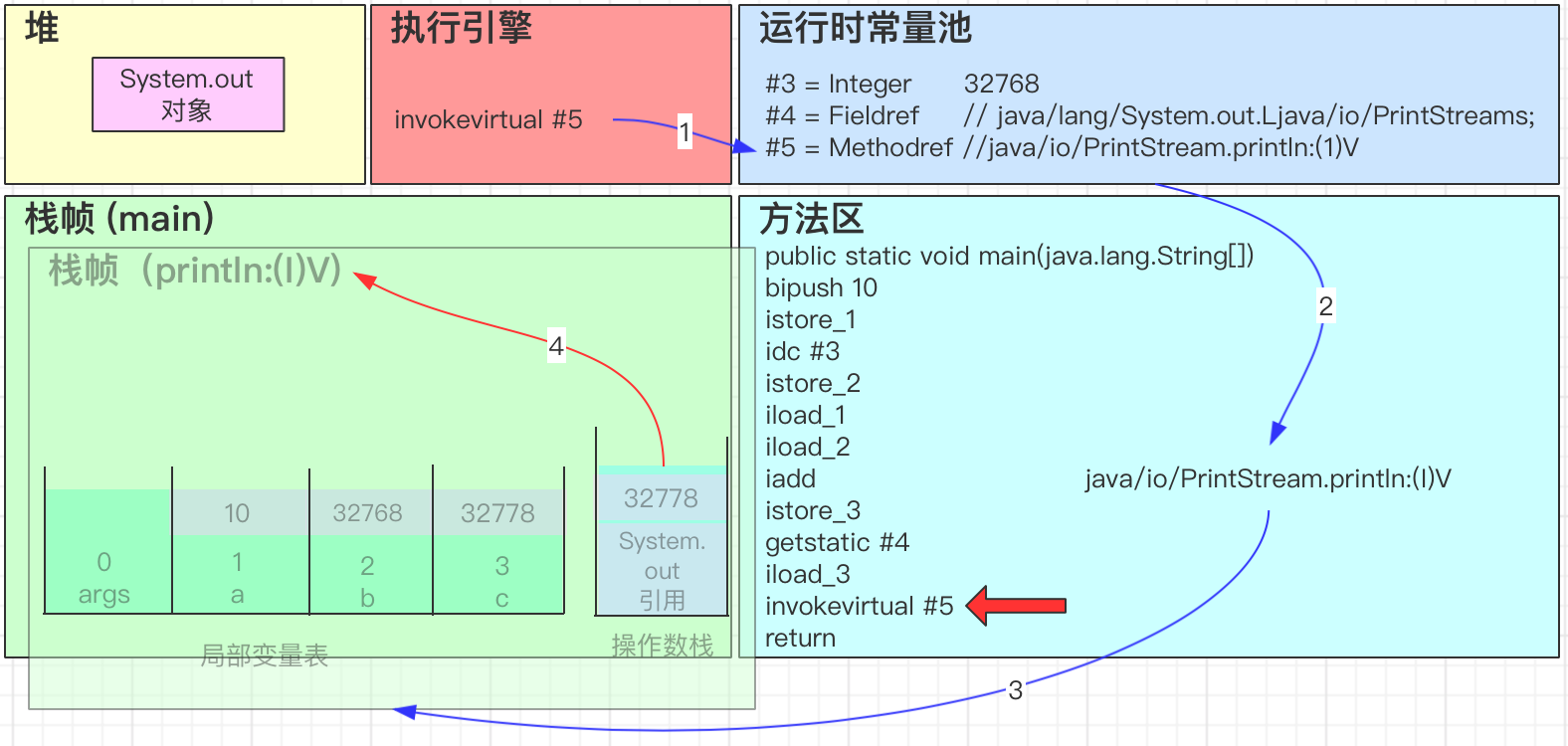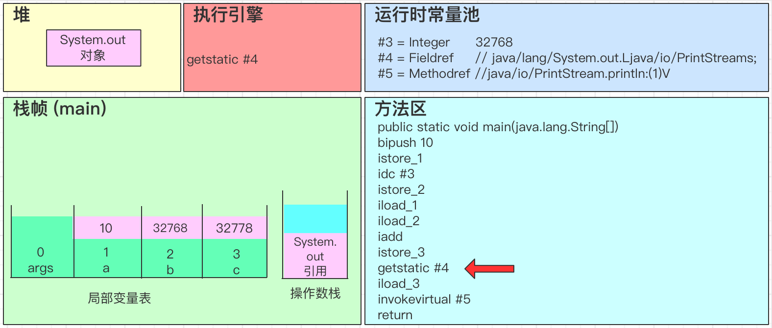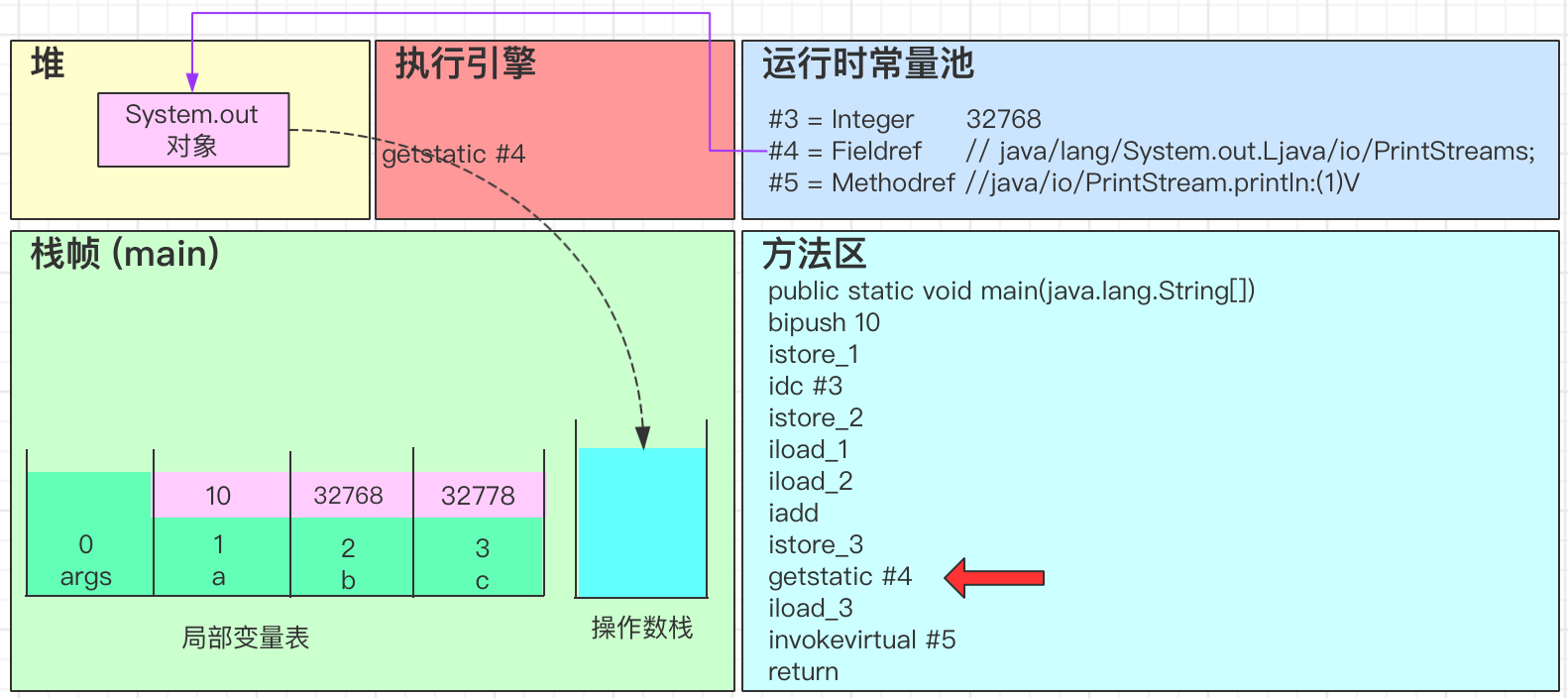 - 去常量池找到成员变量引用,去堆中找到System.out对象。getstatic 会把对象引用放入操作数栈中