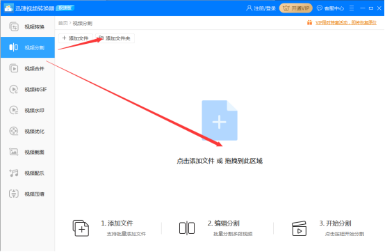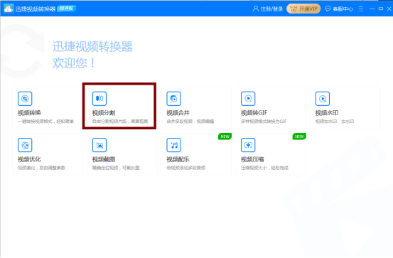 **第一步:**百度搜索迅捷视频转换器,进行下载安装,双击图标打开运行,进入主界面,点击“视频分割”。