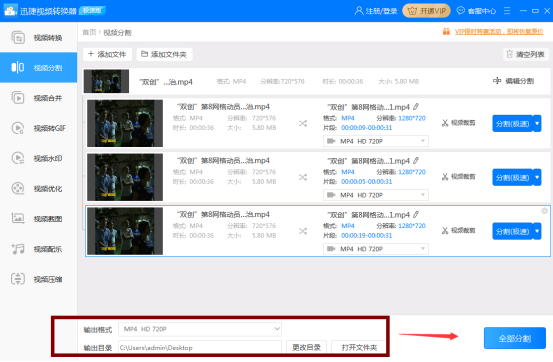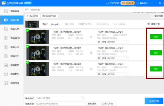 **第四步:**修改输出格式和输出目录,设置完后,直接点击“全部分割”,随后点击“打开”进行查看即可。
