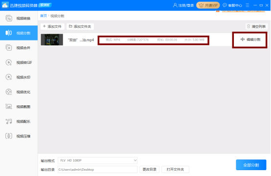 文件成功添加后,视频的格式、分辨率、时长、大小等信息也出来了;此时点击右侧的“编辑分割”。