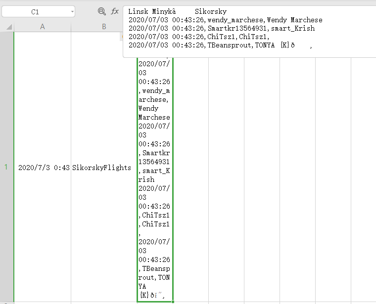 原来,"Linsk Minyk“ 用了英文引号开头,中文引号结尾。WPS遇到引号开头,默认为文本,但是迟迟找不到结束的引号,因此“吸收”了后面的所有行!