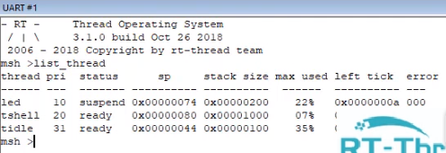 通过命令 list_thread 打印所有线程的信息。图中 tshell 为命令行所在的线程,tidle为空闲线程,