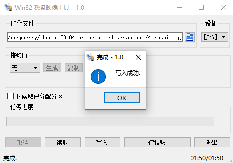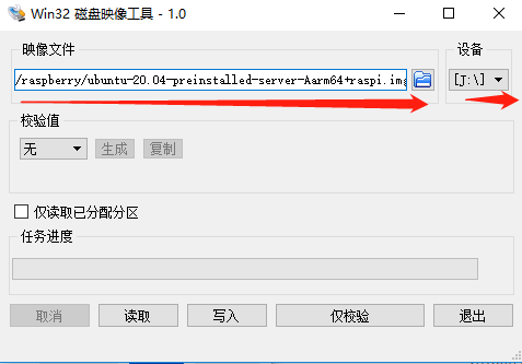 打开win32diskManager,选择需要烧录的镜像文件ubuntu-20.04-preinstalled-server-arm64+raspi.img
