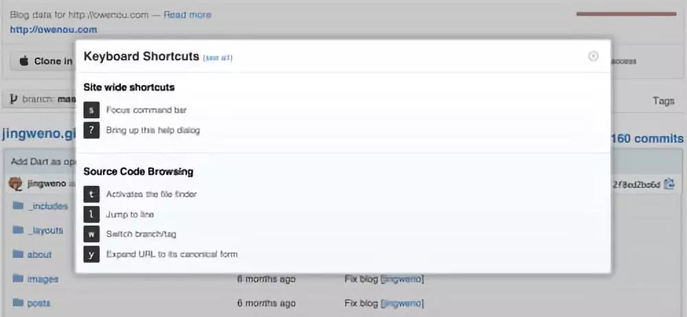 在任意 GitHub 页面中,按 ? 展示当前页面可用的快捷键: