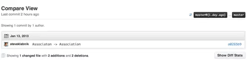 你可以创建一个对比页面通过使用 URL github.com/user/repo/compare/{range}。范围 (range) 可以是两个 SHA 例如 sha1…sha2 或者两个分支名称例如 master…my-branch。范围同时也非常智能的支持使用时间作为关注点。你可以通过 master@{1.day.ago}…master 过滤从昨天开始的提交。例如:链接,https://github.com/rails/rails/compare/master@{1.day.ago}…master 显示 Rails 项目中全部昨天开始的提交记录和变化: