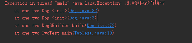 public class TwoTest { public static void main(String [] args) throws Exception { Dog dog =new Dog.Builder().eye("大眼睛").earColour("黑色").build(); System.out.println("狗眼睛是"+dog.getEye()+"#狗眼睛颜色是"+dog.getEyeColour()); } }