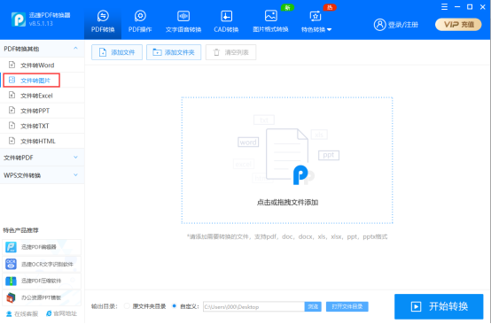 双击打开迅捷PDF转换器,接下来,我们看界面的左侧,有很多的选项,找到其中的“文件转图片”,左键单击一下。
