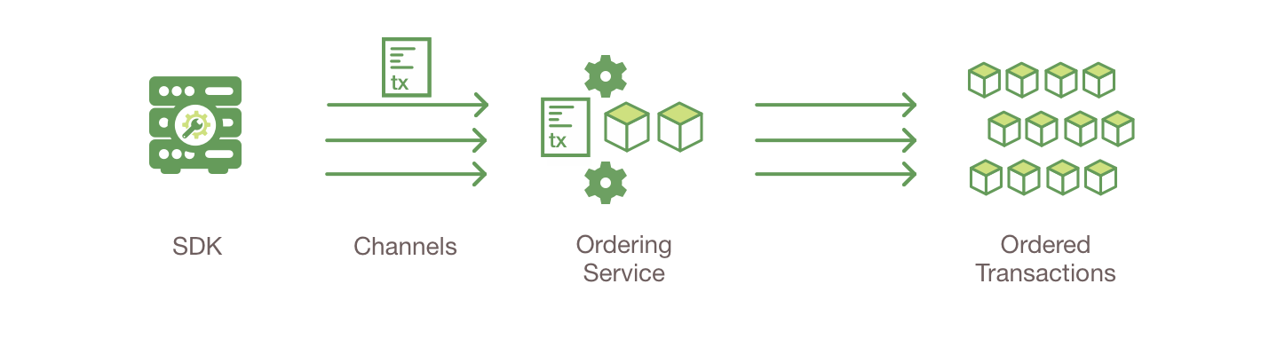 应用程序在“事务消息”中“广播”事务建议和响应到订购服务。事务将包含读/写集,支持同事签名和通道ID。订购服务不需要检查一个事务的整个内容为了执行其操作,它只接收事务从网络中的所有渠道,命令他们按时间顺序由通道,每个通道并创建的事务。