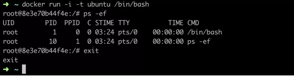 在ubuntu容器中就和在ubuntu服务器一样 执行ps -ef 测试 exit退出