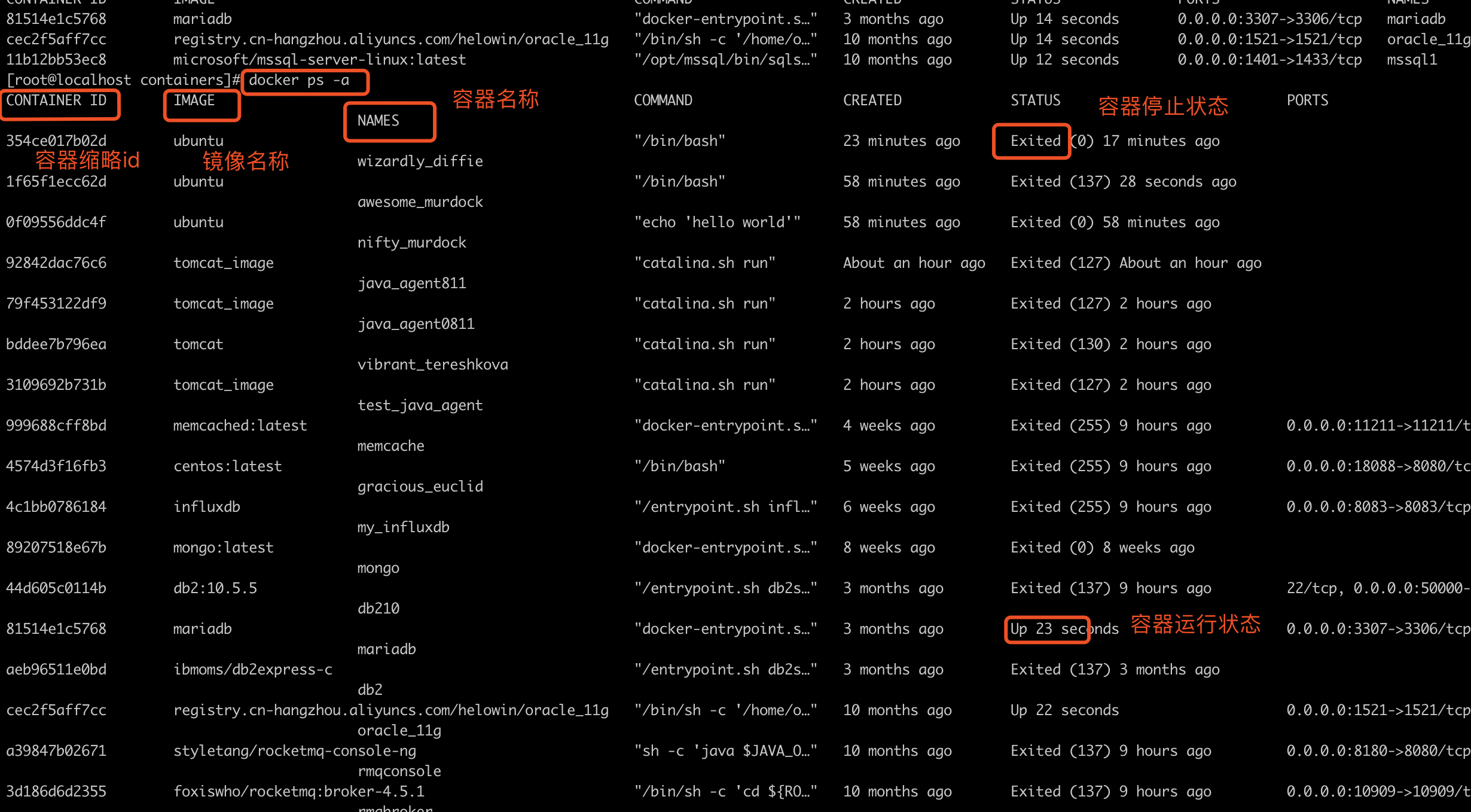 docker ps可以查看运行的容器 加-a可以看已停止的容器