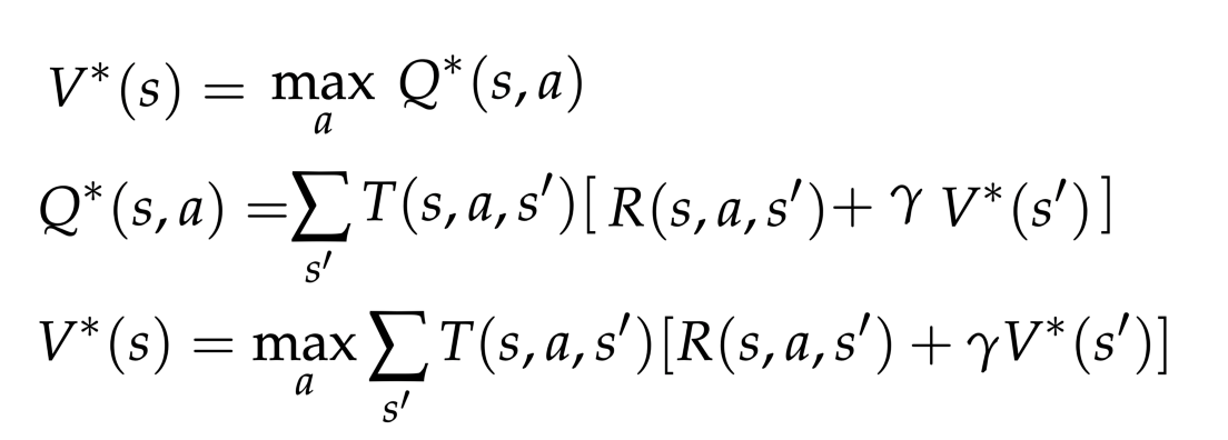 最佳值与最佳动作条件q值相关。然后,值和q值更新规则非常相似(加权转换,奖励和折扣因子)。顶部:值与q值的耦合;中部:Q值递归:,底部:值的迭代。参考:https://inst.eecs.berkeley.edu/~cs188/sp20/