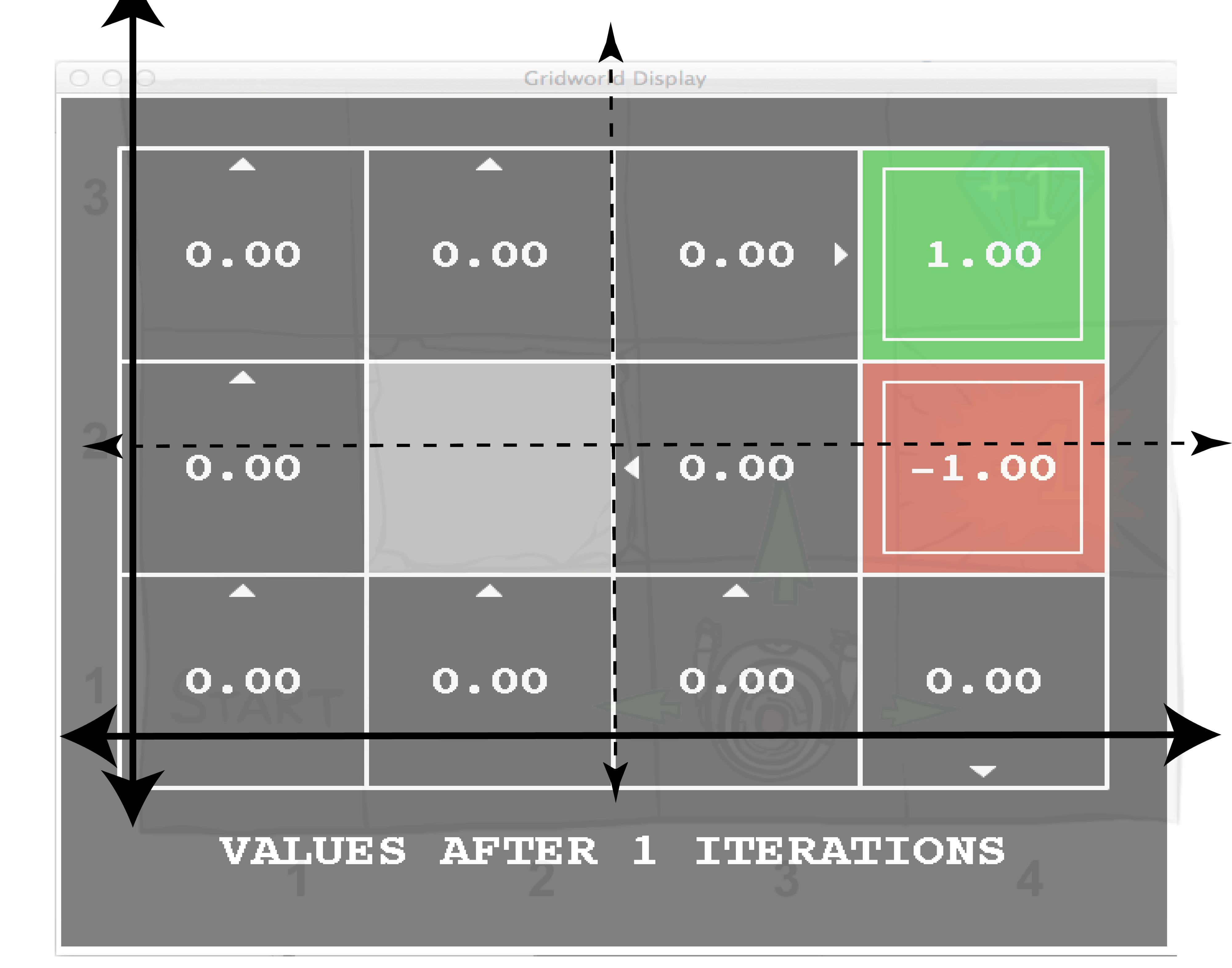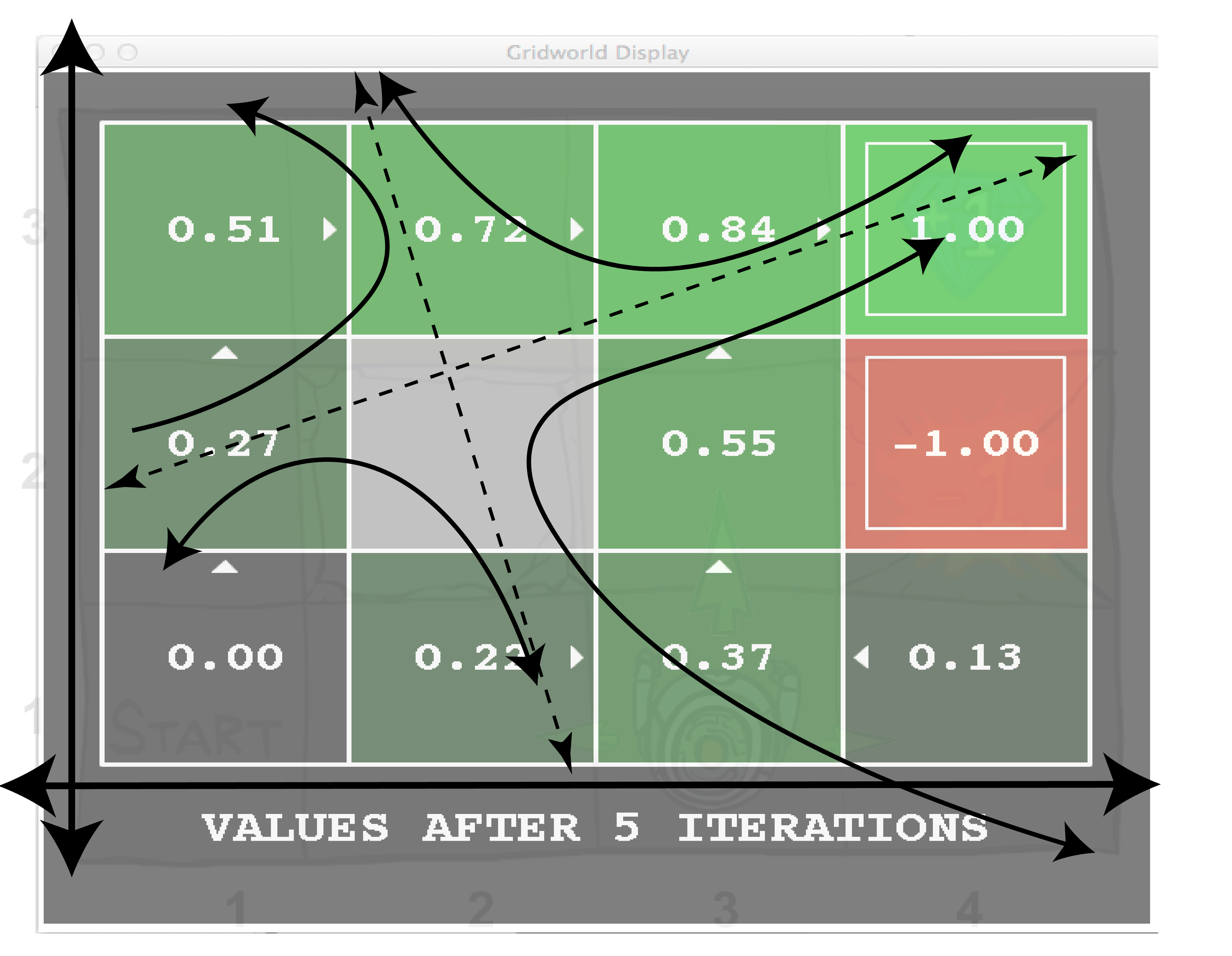- 转移函数T(s,a,s')。T(s,a,s')保持MDP的不确定性。给定当前位置和给定动作,T决定下一个状态出现的频率。