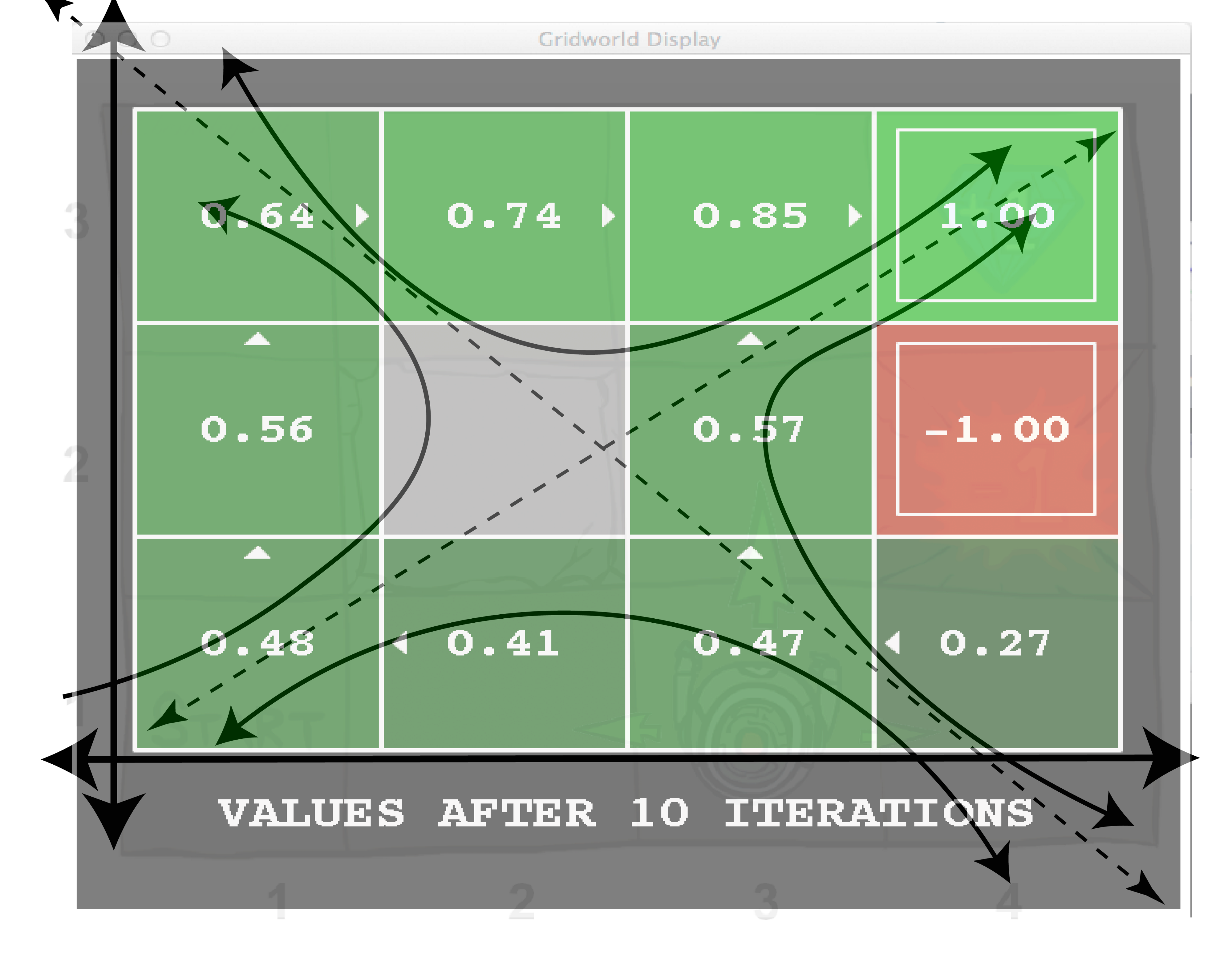 这里的关键点是我们用矩阵(R, T)乘以向量(V,U)来迭代地求出。这些值将从任何初始状态收敛,因为一个状态的值是由它们的近邻s决定的(马尔科夫)。