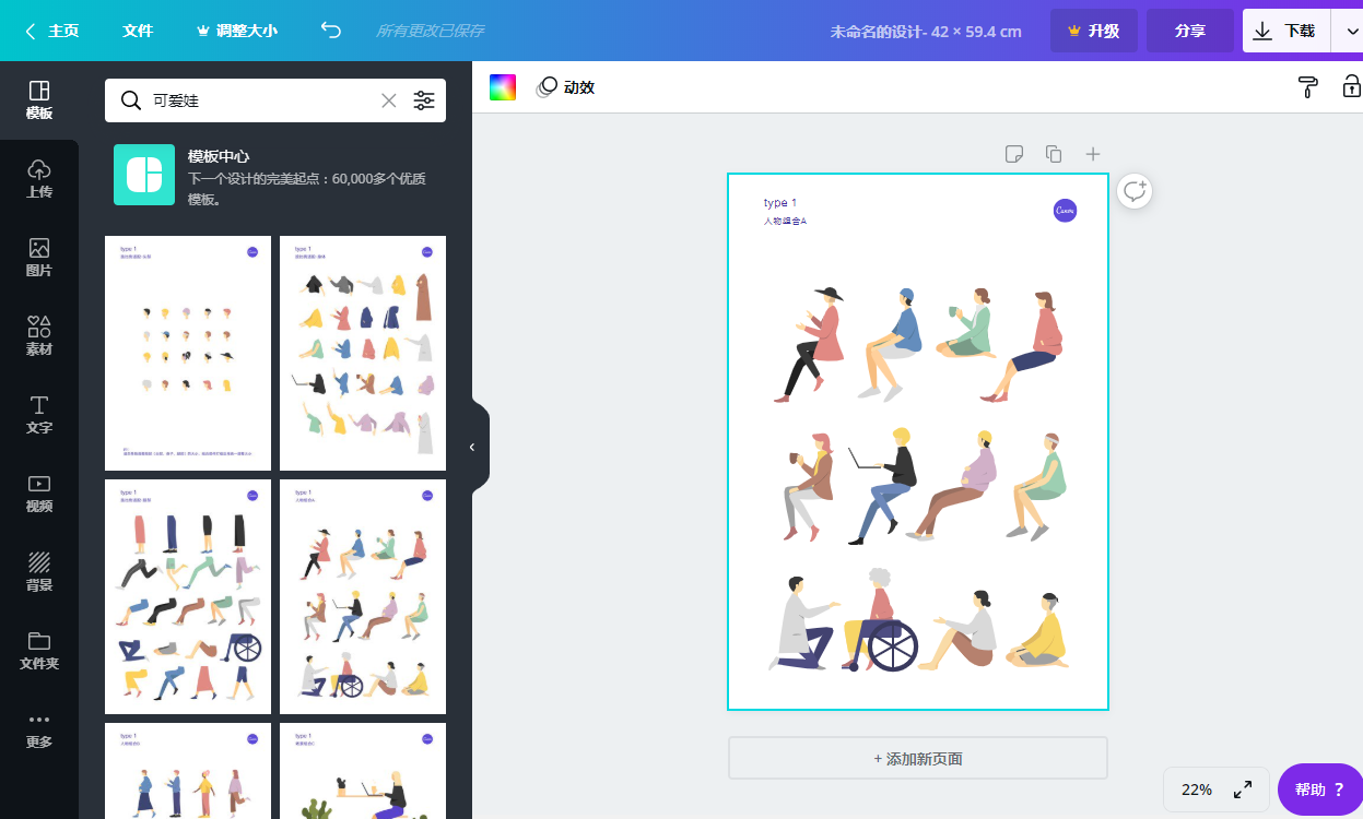 打开Canva官网并进入编辑器,在素材库中搜索关键词「可爱娃」,即可找到一系列扁平风人物组件插画(全部免费可商用)。这套人物组件插画库由Canva设计团队原创,人物的头部、上身、腿部全部可以拆分并自由组合,甚至还能根据你的需求随意改色。