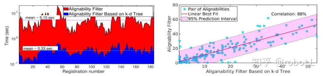 。如图6(左)所示,基于k-d树的可对齐滤波器快于原始滤波器。如第3.D节所示,我们的方法很少依赖点云大小,由于使用了平面中心。而原始方法依赖分割中的点数,导致了更高的计算时间。平均时间少于0.5s(几乎提高了15倍),适合实时表现。