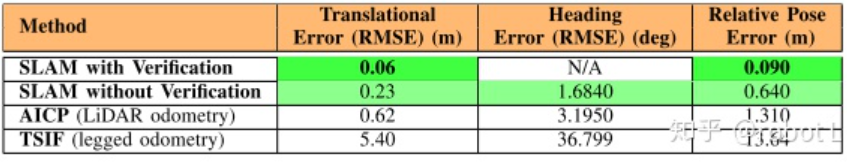 表2展示了有/没有验证的SLAM结果,与AICP LiDAR里程计以及TSIF腿式状态估计器对比。由于Leica TS16没有提供旋转估计,我们使用最好的表现方法——具有验证的SLAM,并比较它和其他算法的轨迹使用ATE度量。基于该实验,具有验证的SLAM的漂移低于0.07%。