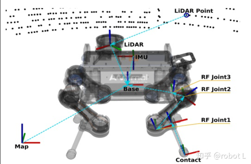 基坐标系的估计随着时间漂移,因为它不适用外部传感器,并且四足的位置和绕z轴的旋转是不可观的。下面,我们定义LiDAR-SLAM系统用于估计机器人相对地图坐标系  的位姿。值得注意的是,TSIF框架估计状态的协方差[24],我们使用它在我们的几何回环检测中。