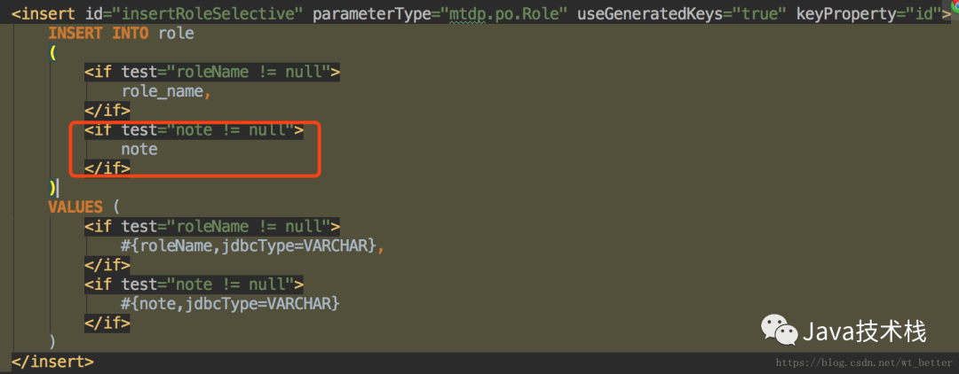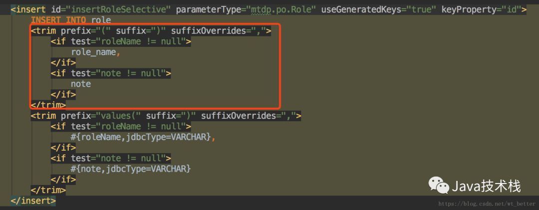 表示去除sql语句结尾多余的逗号,关注公众号Java技术栈获取更多Mybatis教程都是干货哦。